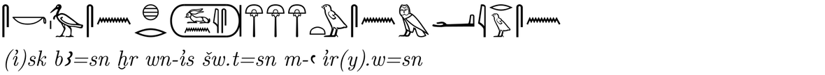 * Traduzione ipotetica: irw: "natura" (Faulkner p. 27) ma anche "rituali" (Vygus p.1063). Il Mercer traduce: "le loro ombre sono portate via dalla mano di coloro a cui appartengono". (Mercer p. 148) translitterando forse come ir(y).w=sn "coloro che sono in relazione con loro".